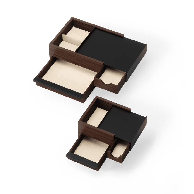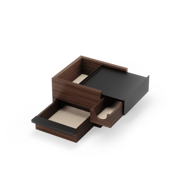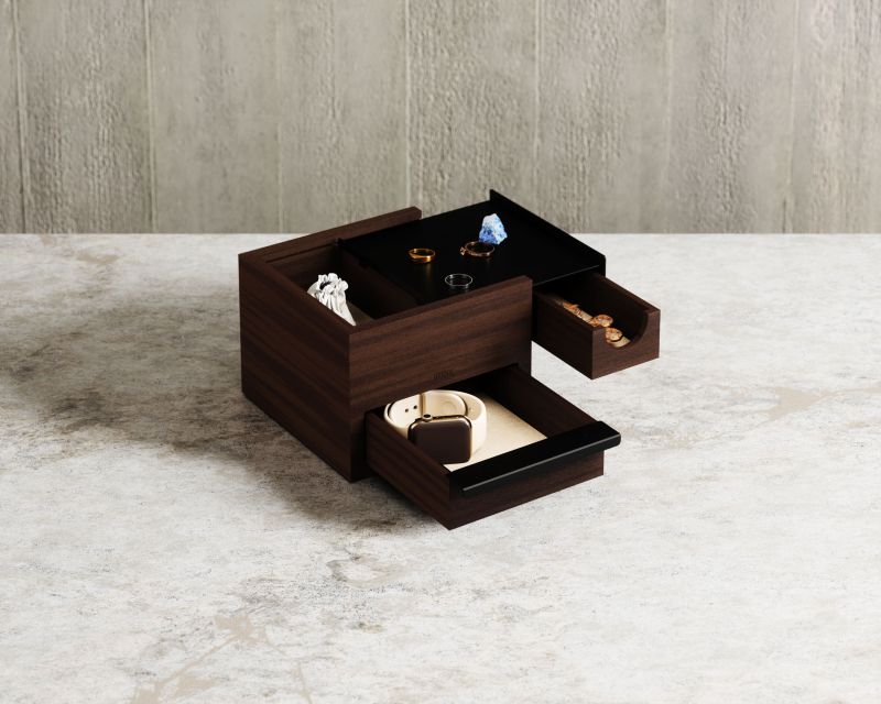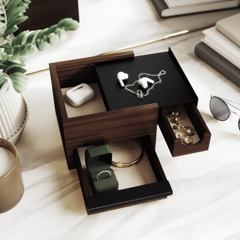 Umbra Mini Stowit Jewelry Box - Modern Keepsake Storage Organizer with Hidden Compartment Drawers for Ring, Bracelet, Watch, Necklace, Earrings, and Accessories (Black / Walnut)