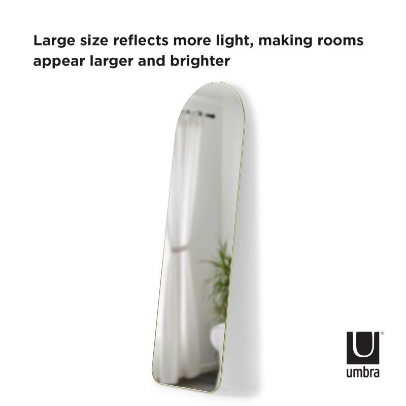 Hubba Arched Leaning Mirror brings a unique arch shape to the standard floor mirror. Featuring soft curves and a thin metallic finish rim, use Hubba in your entryway, bedroom or other living spaces to add a decorative touch, while instantly brightening your space. Measuring, 20 x 62 inches (51 x 157.5 cm), this statement mirror can be leaned up against your wall or mounted with included hardware.