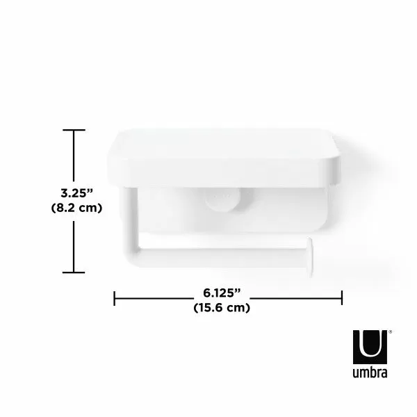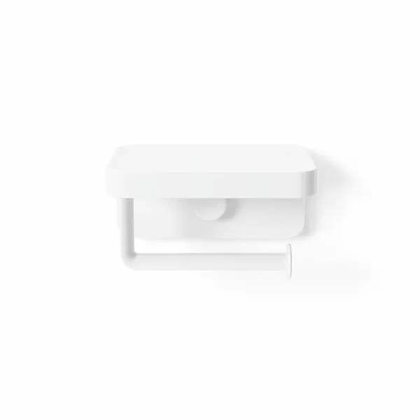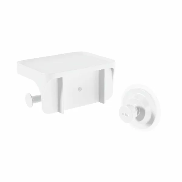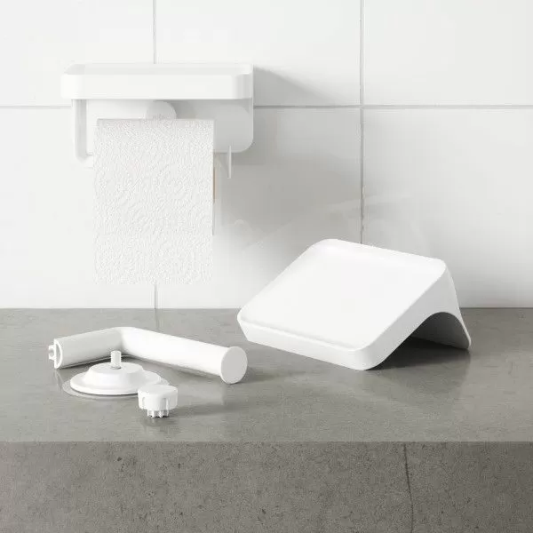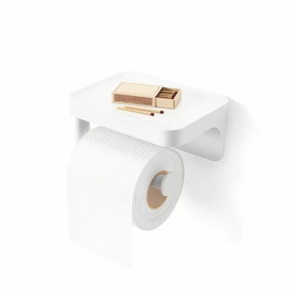 A toilet paper holder and shelf in one, this bathroom essential clears up floor space while providing a handy spot to place your phone, keys or other small accessories. Easy to install, Flex Adhesive Toilet Paper Holder & Shelf includes non-damaging, waterproof adhesive strips that can be applied on various surfaces such as tiles, dry wall, concrete, etc. (does not work on porous surfaces). Accommodating both standard and jumbo-sized toilet paper rolls, this everyday product is easy to reload. No tools are required in its super simple set up and no damage is left behind. An alternative use, the toilet paper holder can also be removed in order to use Flex as a stand-alone bathroom shelf.