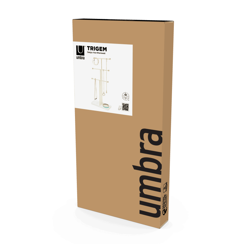 Стойката за бижута Trigem е с три бара на различни нива, които осигуряват достатъчно място за окачване на всички ваши любими колиета; поддържайки ги безопасни, организирани и без заплитане. С височина от 48 см. Trigem е идеален за всякакъв тип колие. Основата на Trigem се ползва като поставка за бижута и за допълнително съхранение на аксесоари. Елегантният дизайн на Trigem допълва всеки модерен декор, а защитената подплатена основа гарантира, че повърхността на плота ви няма да се повреди.