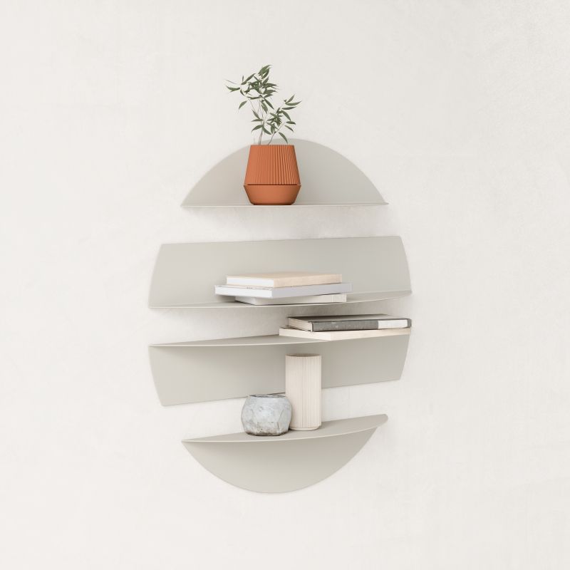 Комплект от четири уникални стенни рафта, които са изработени от масивен метал и могат да се използват заедно за създаване на привличащ вниманието стенен дисплей, който служи като място за съхранение.
