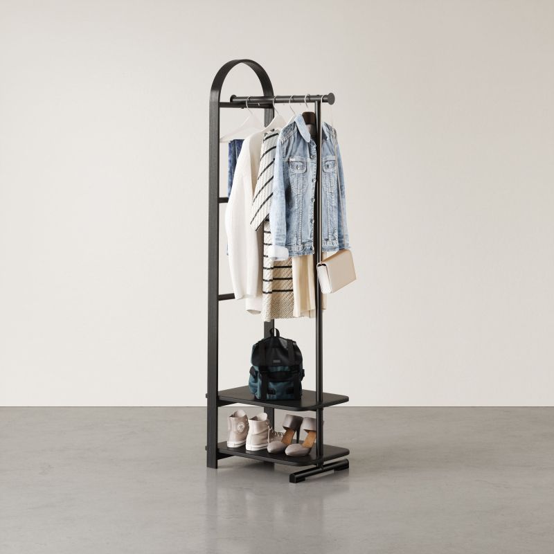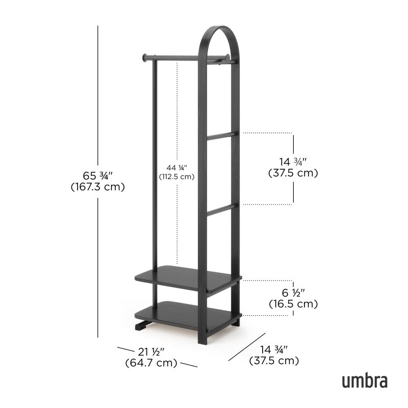 Комбинирайки характерната за Umbra визия с извито дърво и интелигентна функционалност, този многофункционален щендер поддържа палта, чанти и аксесоари спретнато и удобно организирани. Горната релса е подходяща за окачване на дрехи, а долният рафт осигурява допълнително място за съхранение на чанти и обувки – както върху него, така и под него.
