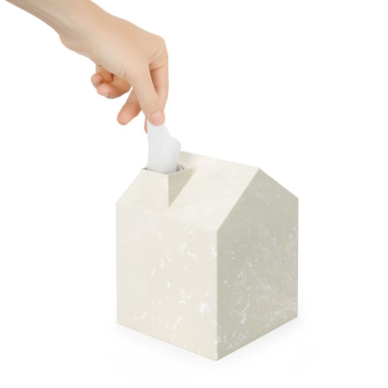 Игривият дизайн на Casa прави вашата стандартна квадратна кутия със салфетка много по-малко скучна. Капакът за кутия е оформен като къща с мъничък комин, от който излизат салфетките, като изглеждат като малък облак дим. Перфектен за покриване на стандартни кубични кутии за салфетки и добавя декоративно докосване към вашата баня, спалня или всяка друга стая във вашия дом или офис.