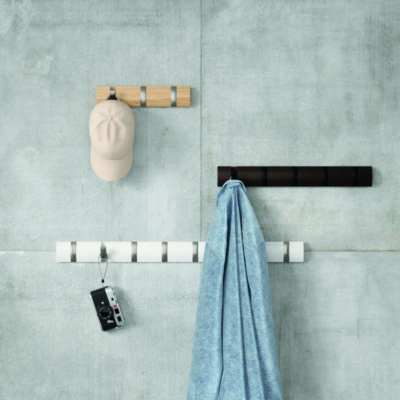 Повече от обикновена закачалка - Flip е уникална стенна релса, която разполага с прибиращи се куки за окачване на различни предмети - палта, шалове, портмонета, чадъри, кърпи, дрехи или чанти. За разлика от традиционните стоящи закачалки, които изяждат ценна площ, Flip се монтира на стената и е решение, което е идеално за малки жилищни пространства или антрета и коридори, благодарение на елегантния си, обтекаем профил и прибиращите се куки, когато не се използва. Предлага се в различни цветове, отговарящи на Вашия съществуващ декор, Flip изглежда страхотно и дава възможност да се използва на почти всяка стена на коридор, спалня, баня или офис. Всички модели Flip са произведени от висококачествена масивна дървесина.